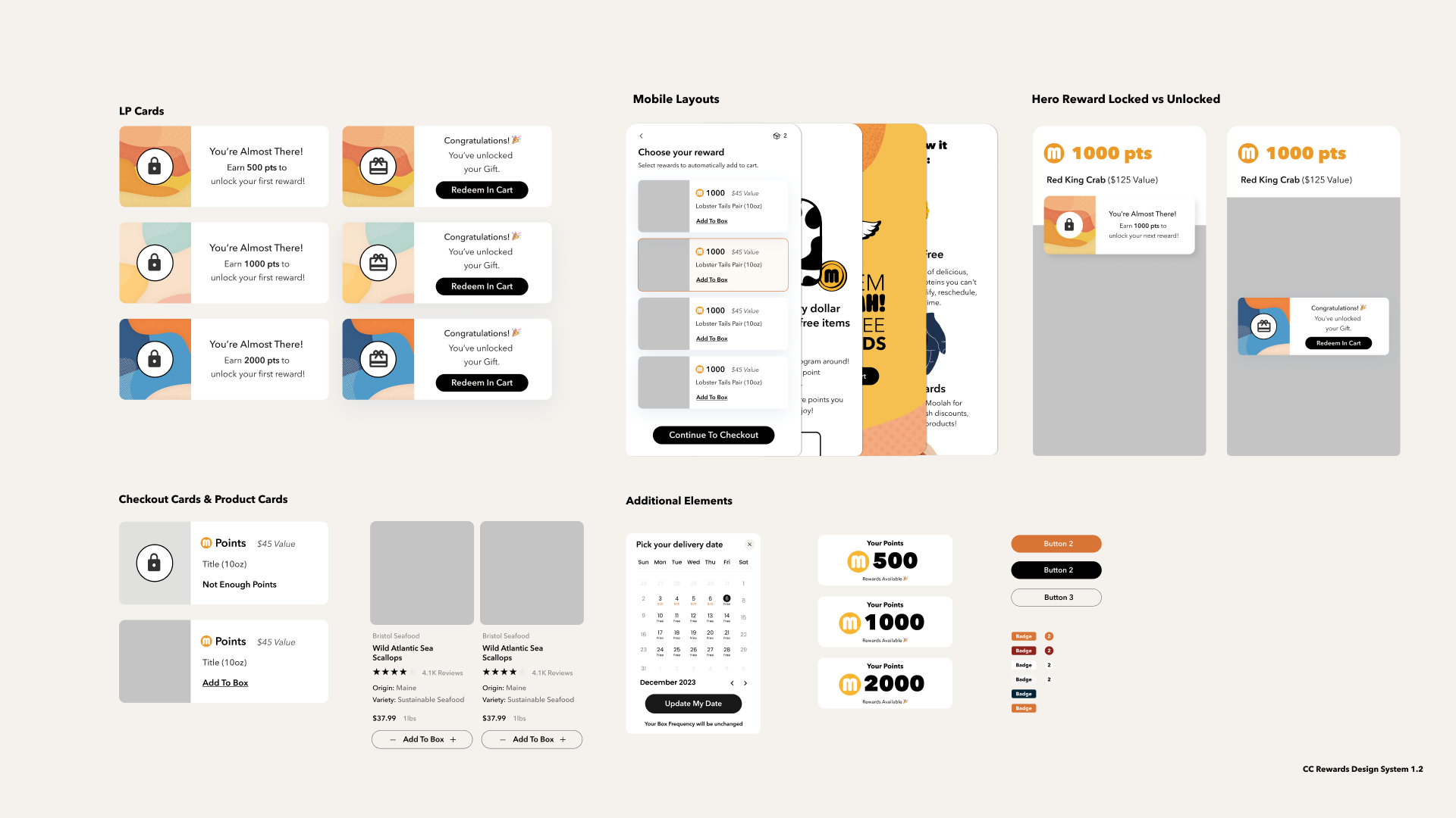 Final designs brought the full identity together, playful visuals, intuitive flows, and clear reward mechanics built into a seamless customer journey. These final mocks show how the design system scaled into real moments of interaction across account pages, product cards, and the rewards landing page.