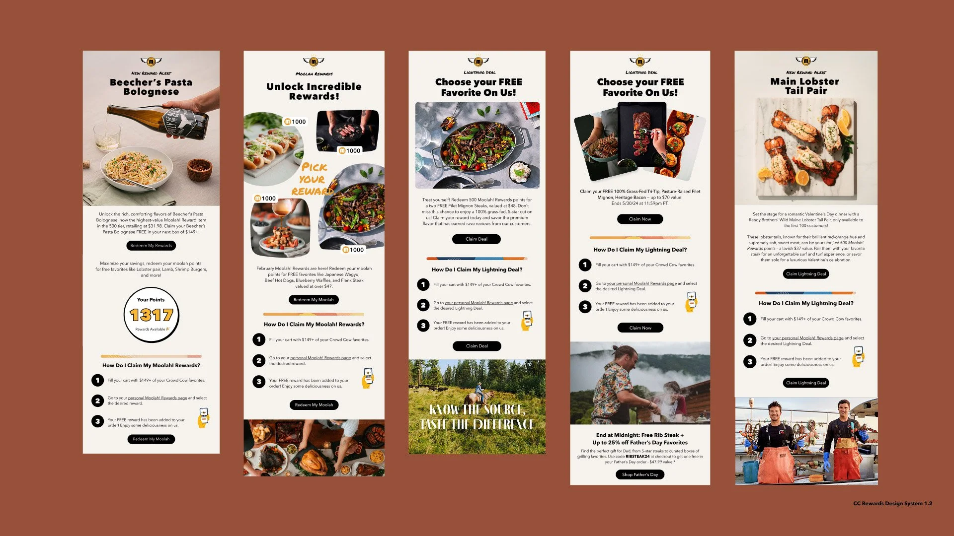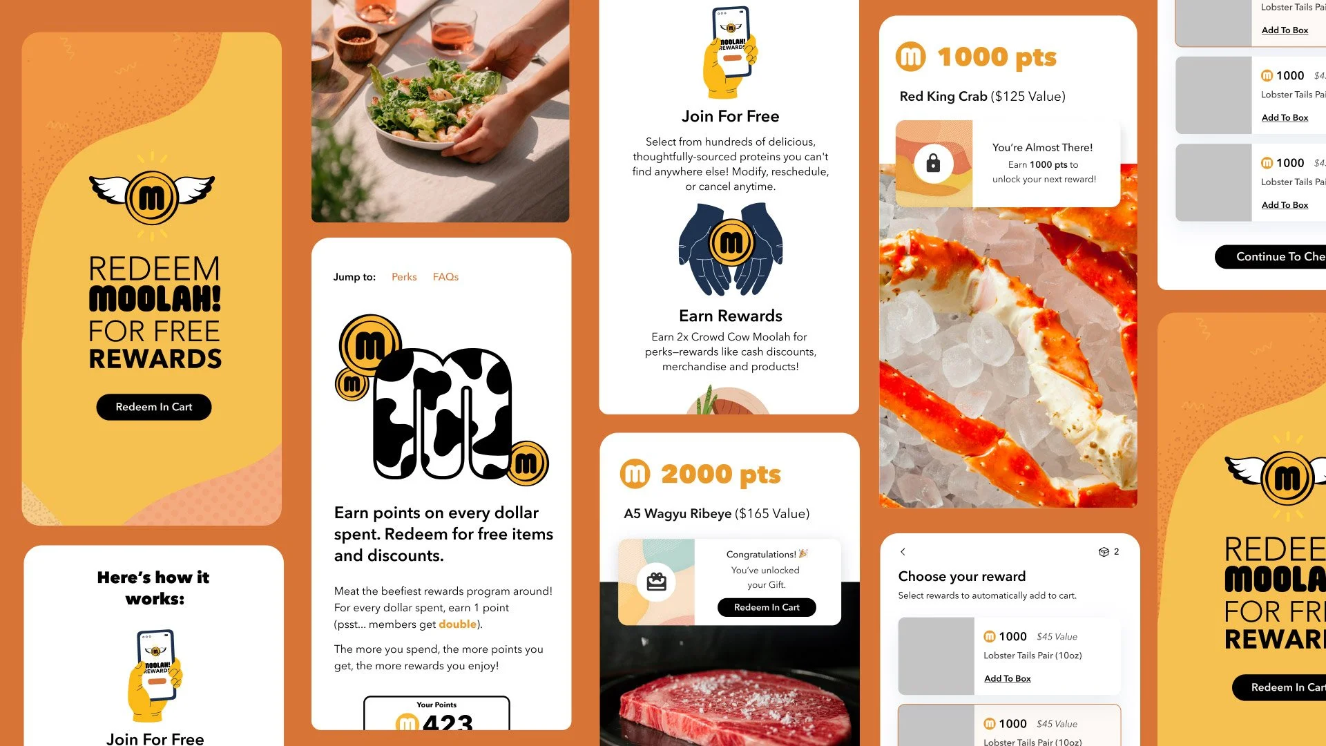 Email played a key role in activating loyalty. We created a set of reward-specific templates that felt unmistakably Moolah while still fitting within the broader Crowd Cow ecosystem. Progress nudges, reward unlocks, and milestone celebrations all carried the same expressive visual tone that defined the program.